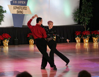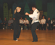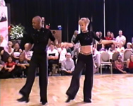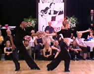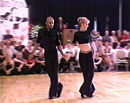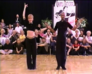 Jeannie's reputation as a Champion Competitor/Master Level dance coach continued to grow throughout the 90s, as she became widely known for her graceful elegance and fierce energy. Her reputation was magnified by her ability to detect the technical root of a dancer's problem and solve that problem through the principles of "body mechanics" combined with correct dance technique. Simultaneously, Jeannie's student following grew rapidly as dancers at all levels sought the efficient and fluid use of their bodies to "feel" and interpret music. Jeannie had more physical challenges to come...During her 1993 World Swing Dance Championship Jack & Jill Finals, Jeannie tore the PCL of her right knee. She continued to compete and instruct during the next 5+ years while sheparding and rehabilitating her often swollen and painful, degenerating knee. In late spring, 1999, Jeannie began rehearsing a routine for the November 1999 U. S. Open Swing Dance Championships. Several days before the Open, in practice, the knee gave out totally and 2 days before the Open Jeannie was forced to undergo emergency knee surgery. Again, intensive rehabilitation was required even as Jeannie continued to teach -- often from her wheel chair on the dance floor -- a fully booked private coaching schedule and a weekly public class at the Cactus Moon Cafe. With a wonderful support group of family, friends, and students, she was able to make a fast recovery and give her original, albeit postponed, 1999 competitive performance at the May 2000 Grand National Swing Dance Championships, Classic Division. (View Video Clip) |